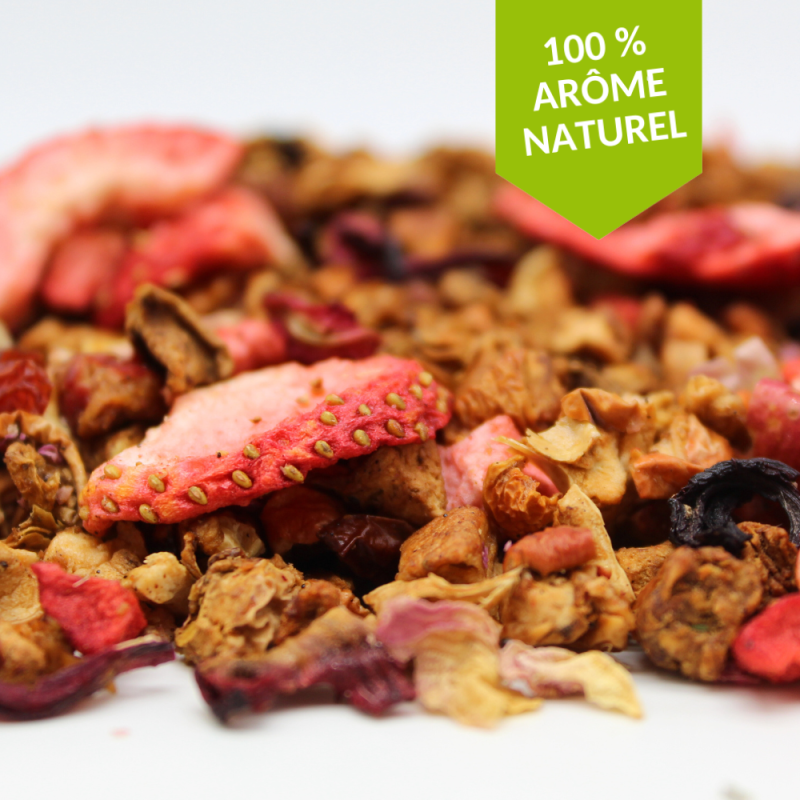 Ingrédients : Pomme, hibiscus, cynorrhodon, arôme naturel, fraise 2%, pétales de rose, bourbon vanille.
