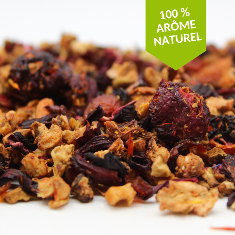 Ingrédients : Pomme*, arôme naturel, hibiscus*, cynorrhodon*, ananas*, citronnelle*, framboises* 2%, pétales* de souci.
