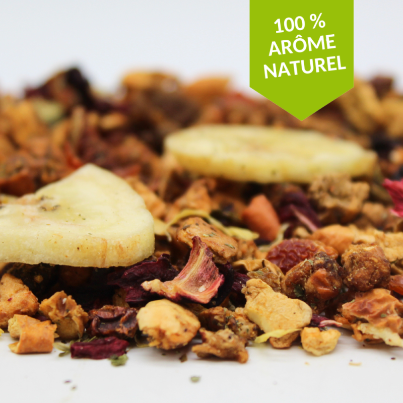 Ingrédients : Pomme*, hibiscus*, arôme naturel d'orange*, cynorrhodon*, arôme naturel de mangue, mélisse*, fruits exotiques* 3,6% (chips de banane* (banane*, huile de noix de coco*, sucre*, miel*), mangue*), arôme naturel de passion, écorces d‘orange* 2,6%, fleurs de souci*.