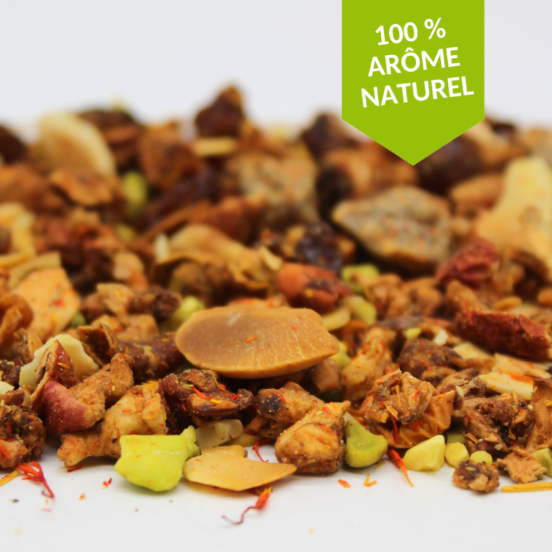 Ingrédients : pomme, figues, raisin, pistache, amande, noisette, arômes naturels, carthame, fève de tonka.
