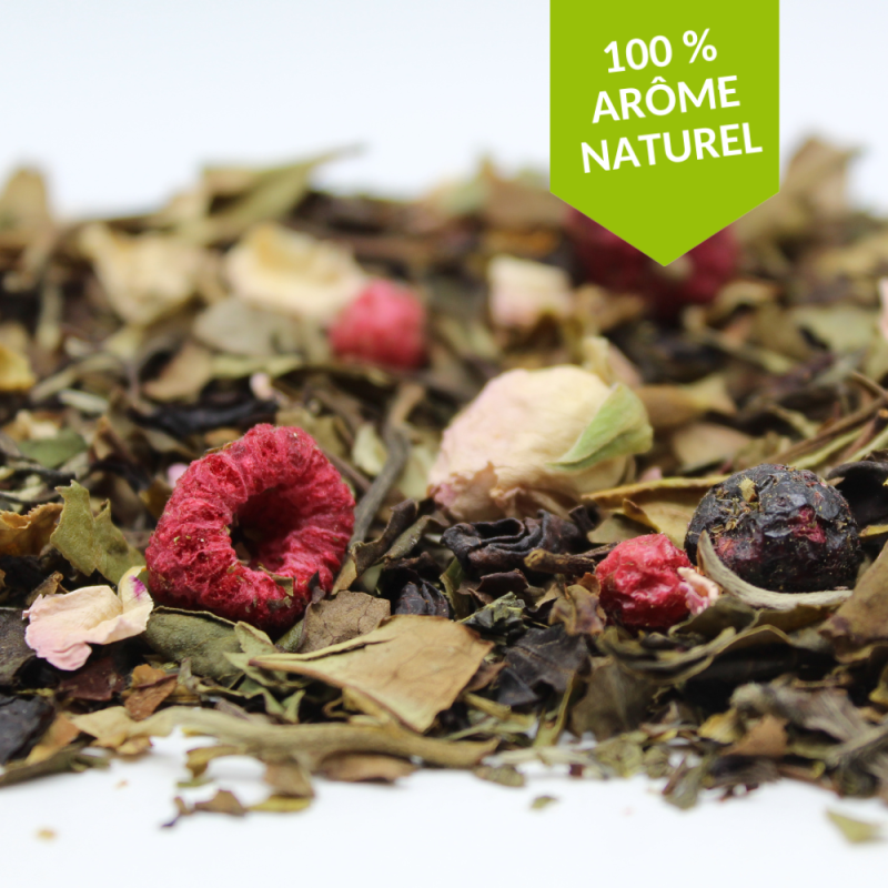 Saveur groseille framboise. Mélange de thé, plantes et fruits.