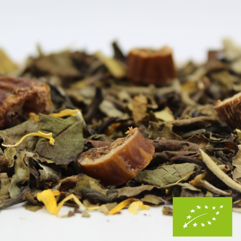 Ingrédients : Thé* blanc Pai Mu Tan, thé* vert Chun Mee, datte* (datte*, farine de riz*), cannelle*, raisin* (raisin*, huile de tournesol*), arôme naturel, fleurs de souci*.
