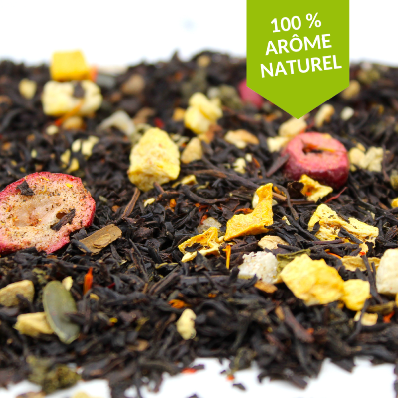 L'alliance fruité d'un thé vert, d'un thé noir et d'un thé Oolong. Mélange de thés et fruits.