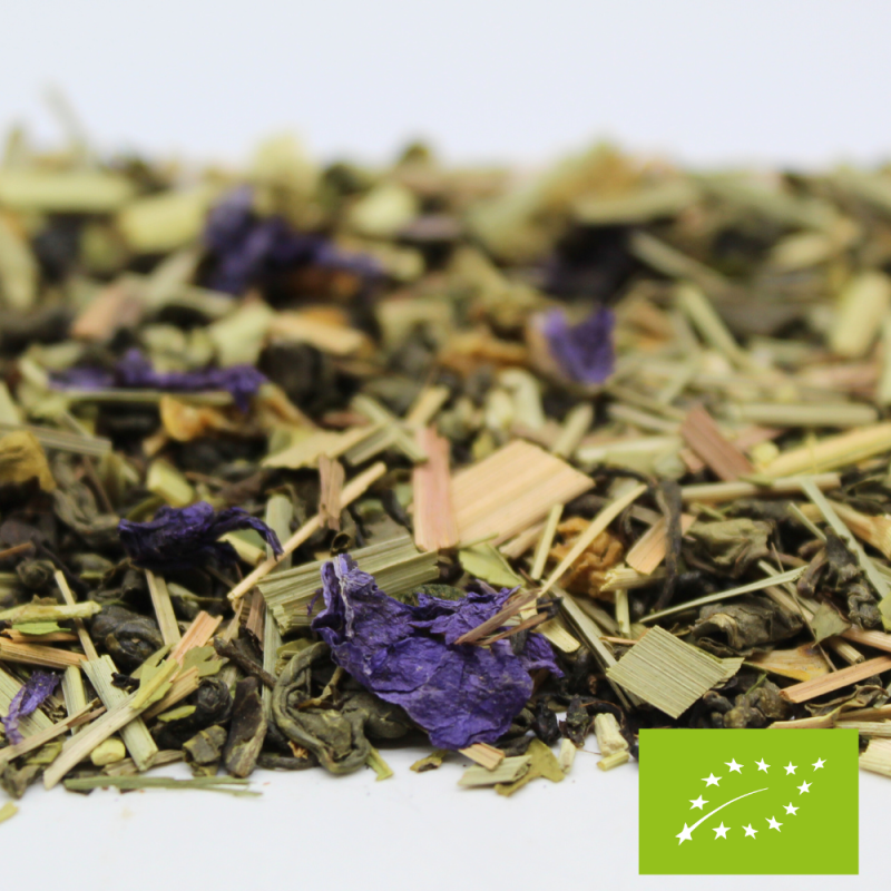 Ingrédients : Thé vert de Chine Sencha*, menthe*, citronnelle*, écorces de citron* 1%, arômes naturels*, fleurs de souci*, mangue* 1%.