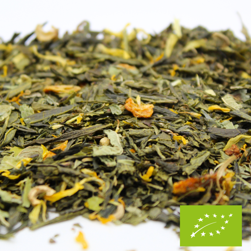 Ingrédients : Thé* vert Sencha de Chine, pétales de souci*, écorces d‘orange*, mélisse*, verveine* , mandarine* 2,1%,huiles essentielles (de pamplemousse*, de mandarine*) passiflore*, thé* jasmin Dragon Pearls de Chine, mangue*, tilleul*.